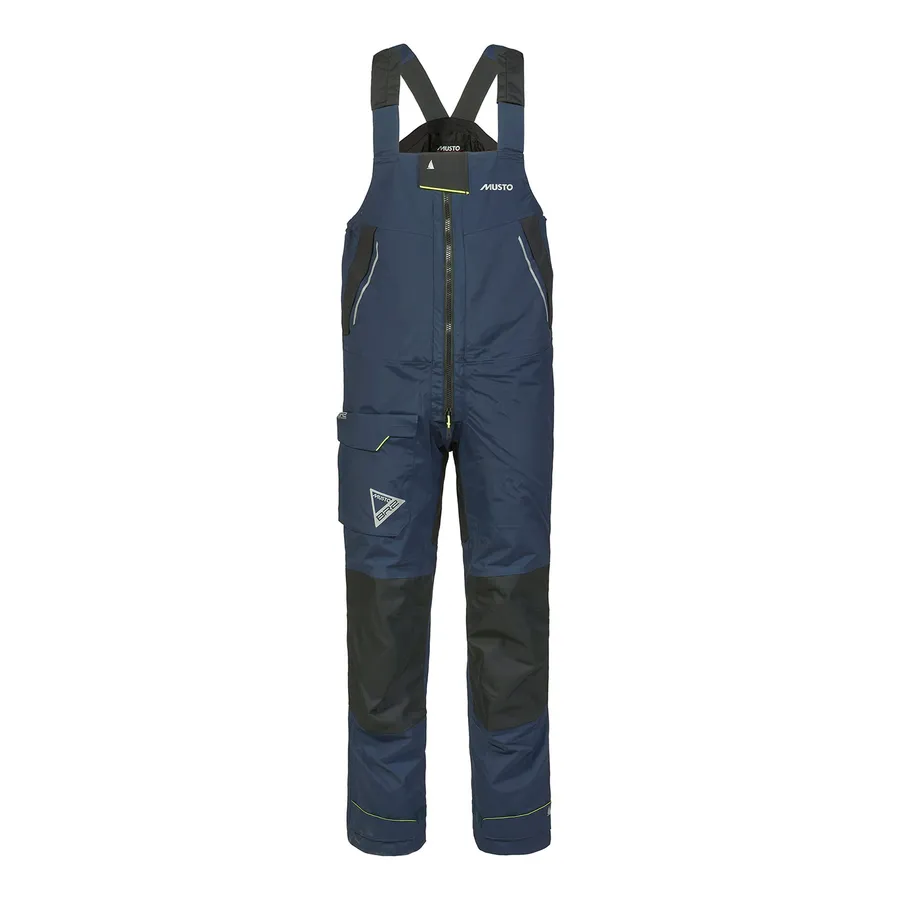 Rugged offshore salopette trousers using highly waterproof Musto fabric for durable protection and comfort during demanding sailing conditions.